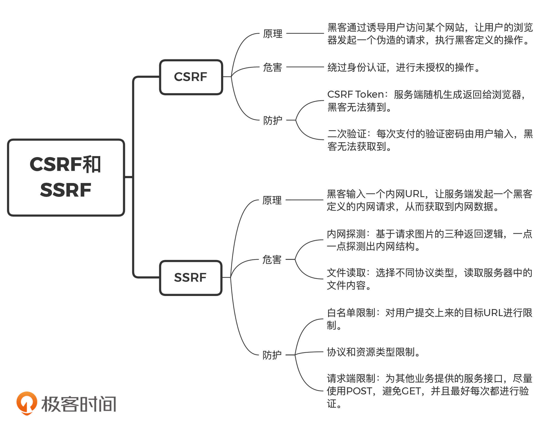 除此之外,CSRF和SSRF产生于正常的业务功能逻辑中,因此,我们没有办法从根本上阻止黑客发起伪造的请求。但是,你可以通过加强接口的安全验证,来避免伪造请求造成影响。在CSRF中,我们可以通过CSRF Token或者二次验证等操作来加强防护。这样,黑客无法获取到隐私信息,也就无法发起连续的请求了。在SSRF中,我们则需要限制可请求的域名,来限制黑客能够访问到的资源。另外,目标服务端,也需要加强接口的验证,来避免伪造请求成功通过授权。