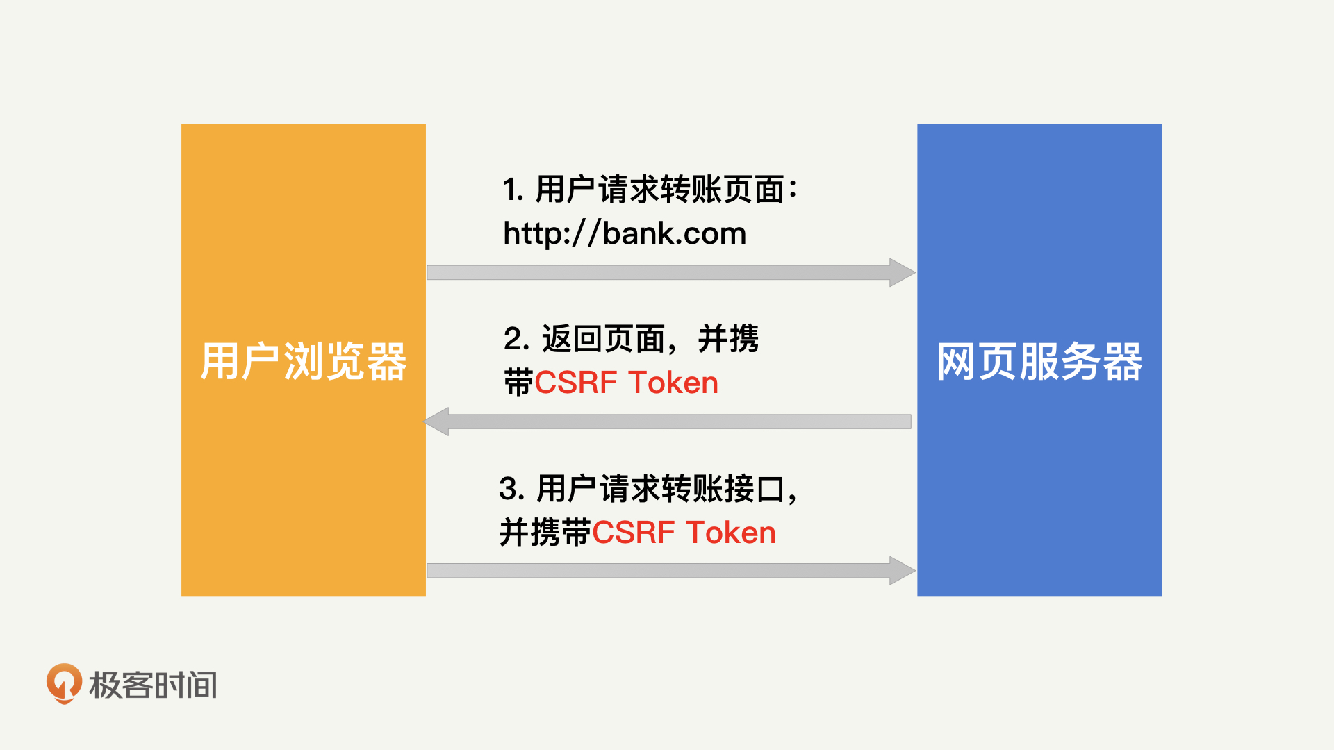 怎么理解呢?假如说,黑客通过CSRF攻击,替你发起了一笔转账。在支付的时候,银行会发起一个全新的页面,让你验证支付密码。这个时候你发现,这个支付请求不是你本人发起的,那你肯定不会输入支付密码来完成验证。所以,在用户进行支付这样的敏感操作时,应用通常会要求用户提供一些私密的信息,就是为了对CSRF攻击进行防护。