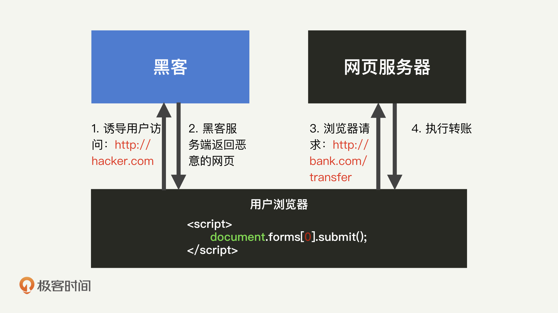 我们还是先来看一个例子。在平常使用浏览器访问各种网页的时候,是否遇到过,自己的银行应用突然发起了一笔转账,又或者,你的微博突然发送了一条内容?