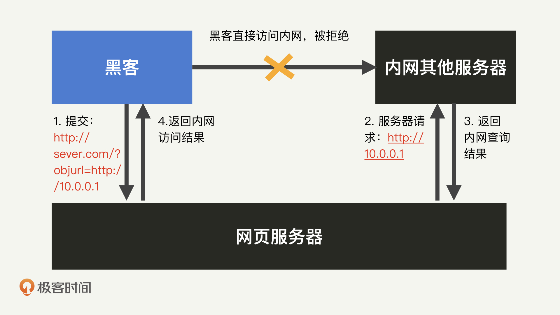 这个时候,只要黑客在输入中提交一个内网URL,就能让服务端发起一个黑客定义的内网请求,从而获取到内网数据。这就是SSRF(Server Side Request Forgery,服务端请求伪造)的原理。而服务端作为内网设备,通常具备很高的权限,所以,这个伪造的请求往往因为能绕过大部分的认证和授权机制,而产生很严重的后果。