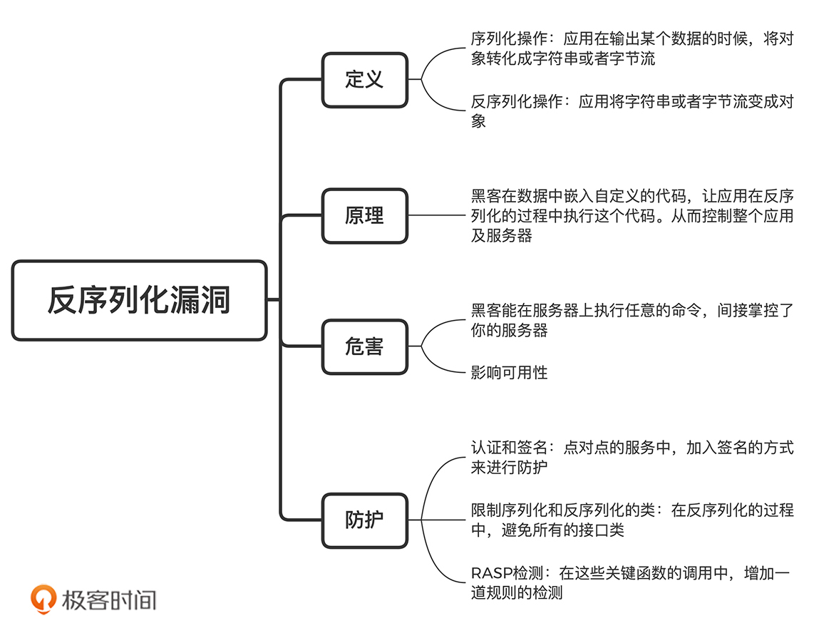 我们首先讲了反序列化漏洞的产生原理,即黑客通过构造恶意的序列化数据,从而控制应用在反序列化过程中需要调用的类方法,最终实现任意方法调用。如果在这些方法中有命令执行的方法,黑客就可以在服务器上执行任意的命令。