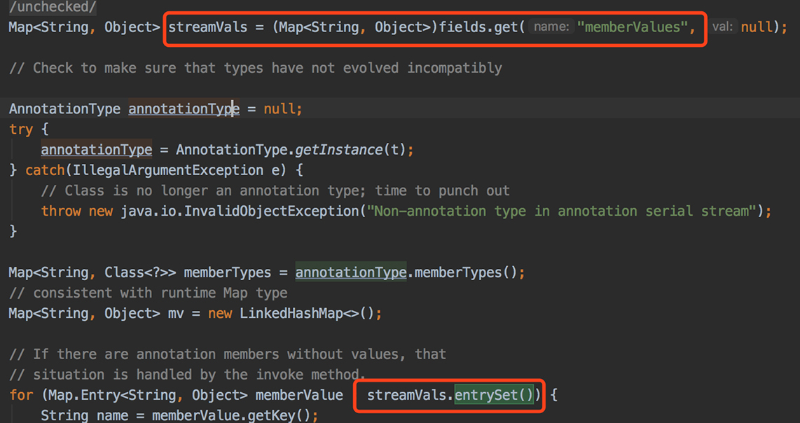 在Java通过ObjectInputStream.readObject()进行反序列化操作的时候,ObjectInputStream会根据序列化数据寻找对应的实现类(在payload中是sun.reflect.annotation.AnnotationInvocationHandler)。如果实现类存在,Java就会调用其readObject方法。因此,AnnotationInvocationHandler.readObject方法在反序列化过程中会被调用。