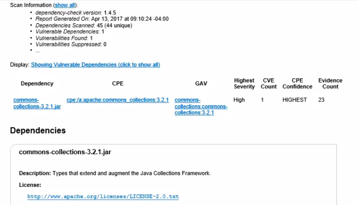 那实际工作中,我们其实也可以借助工具,自动化地完成匹配公开漏洞库的工作。OWASP Dependency-Check是一款专门进行插件漏洞检测的工具。它会将工程内的插件和公开的漏洞库进行比对。最终,会生成一个网页形式的报告,使你对工程中的插件漏洞一目了然了。下图就展示了,如何通过OWASP Dependency-Check发现一个3.2.1版本的Commons-Collections的高危漏洞。