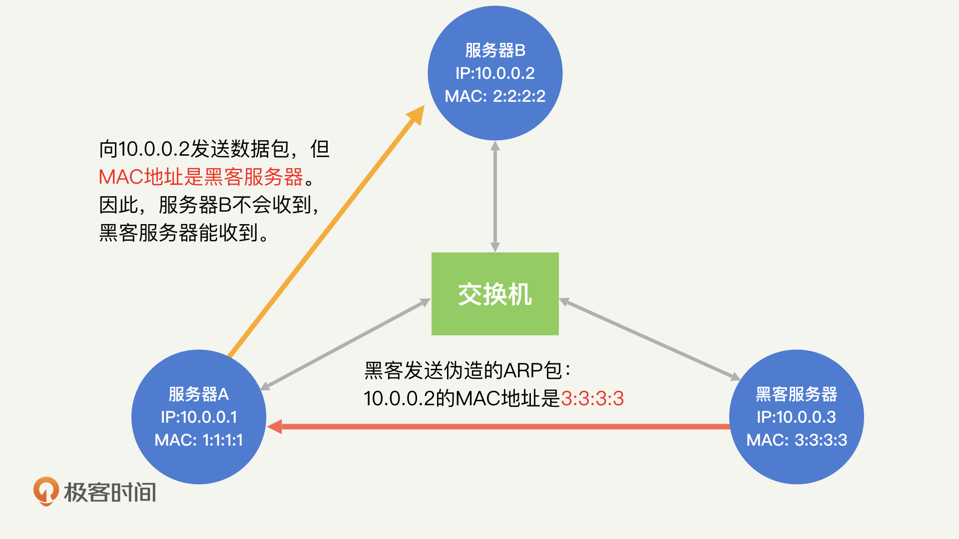 为了帮助你理解这个过程,我把ARP“劫持”的过程总结成了一张图。从这张图中,我们能看到,服务器A想要向服务器B发起请求,但是黑客通过发送伪造的ARP包误导A说:“10.0.0.2的MAC地址是3:3:3:3”。因为ARP没有进行认证,所以A会无条件相信黑客的说法。那么,当A想要向B发送请求的时候,MAC地址会设定成黑客的3:3:3:3,所以请求最终就发送到了黑客的服务器上。DNS“劫持”的原理,和这个比较类似,也是黑客误导服务器,让服务器错认黑客的IP为某个域名的IP。