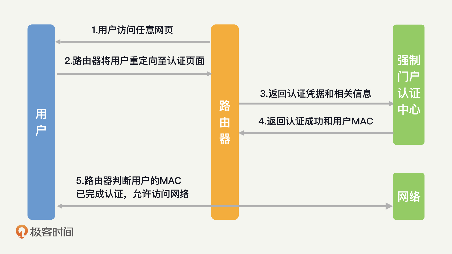 一般的操作是对连入的用户实行“强制门户”。“强制门户”你应该很熟悉,就是当你使用公用密钥连入网络之后,还需要你在网页中再次进行认证。比如,在连入机场网络后,还需要你进行手机号验证。具体的原理就是,用户在连入Wi-Fi后,路由器会将用户的HTTP请求重定向至认证页面。认证成功后,路由器会记录用户的身份和MAC,后续路由器就可以根据MAC来识别用户身份了。