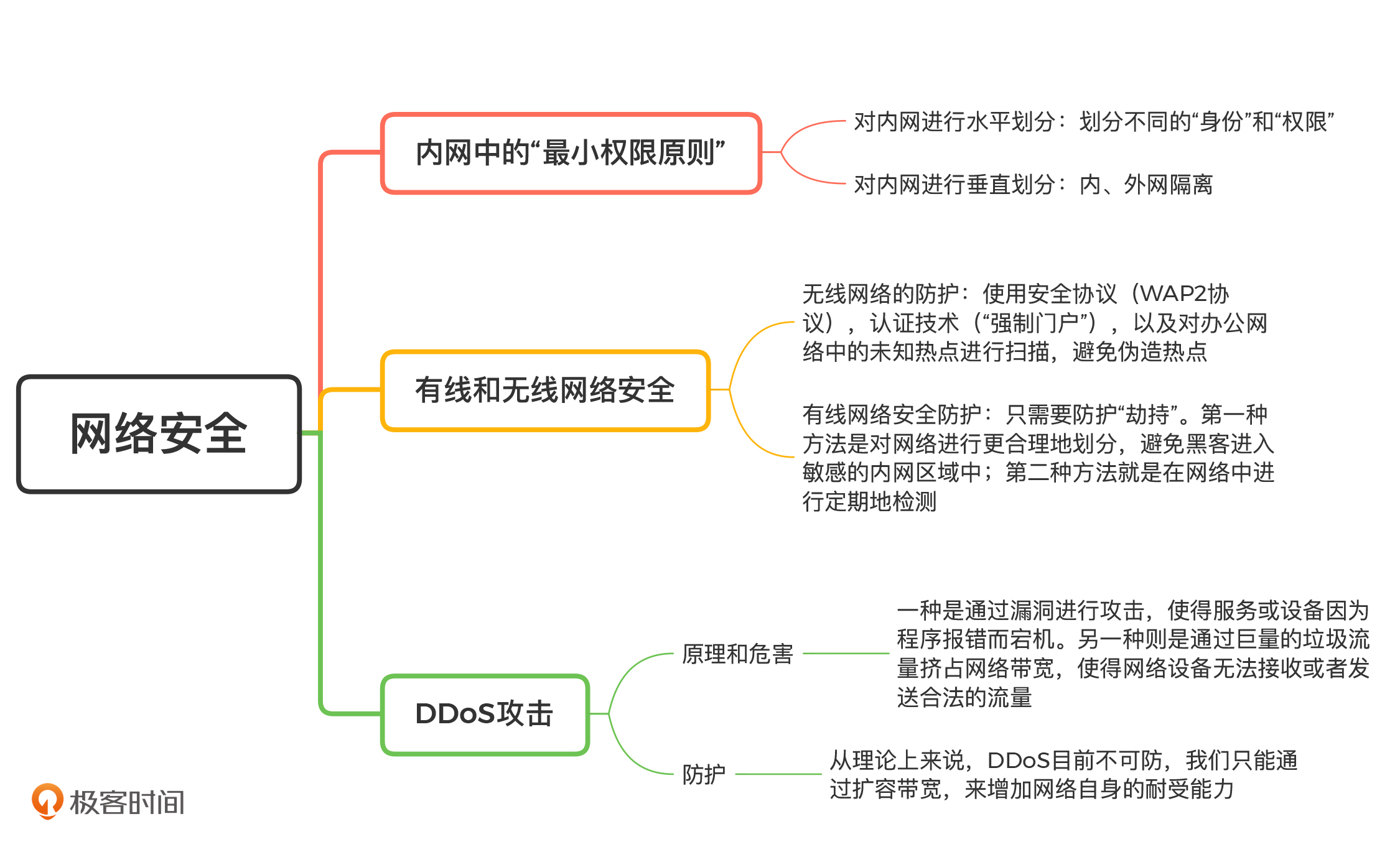 现在,你应该知道如何在内网中落实“最小权限原则”了。而网络作为一个数据传输的主要通道,保障其中数据的安全性,也是非常重要的。这其中包括两个关键问题。