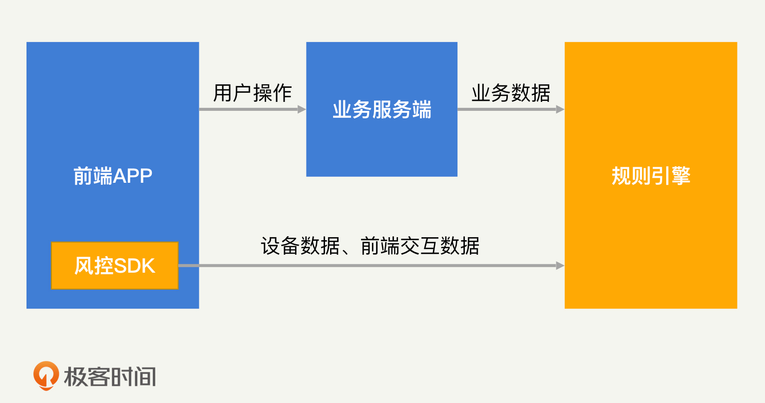 但是,业务在正常的开发过程中,一般不会采集和业务无关的数据(比如设备相关的信息)。为了解决这个问题,风控系统通常会提供一个前端SDK。前端SDK由业务集成在前端应用中,它可以采集各类前端数据,如手机型号、硬件类型等。