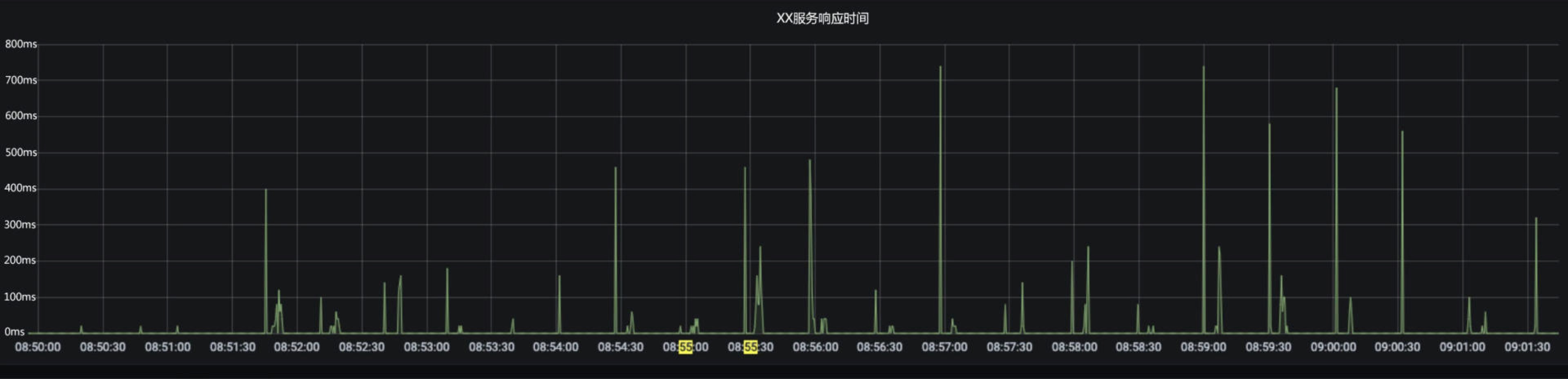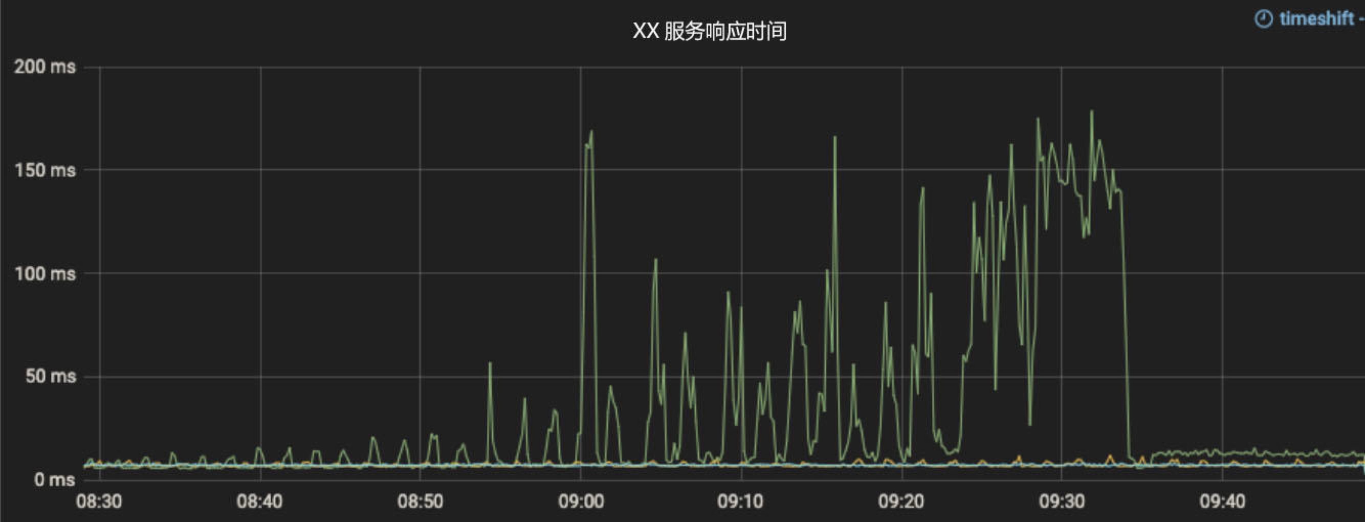 没有找到根因的抖动是很危险的,因为你根本不知道它未来会不会导致大事故的发生。我们再来看一个例子,如下图所示,同样是有一个服务的响应时间,每隔一段不固定周期就会出现一个尖刺,似乎也没有影响用户。但经过排查后,发现该服务会在一些特殊情况下调用某第三方服务,用作补偿数据,这次额外的调用会引发响应时间的增加。