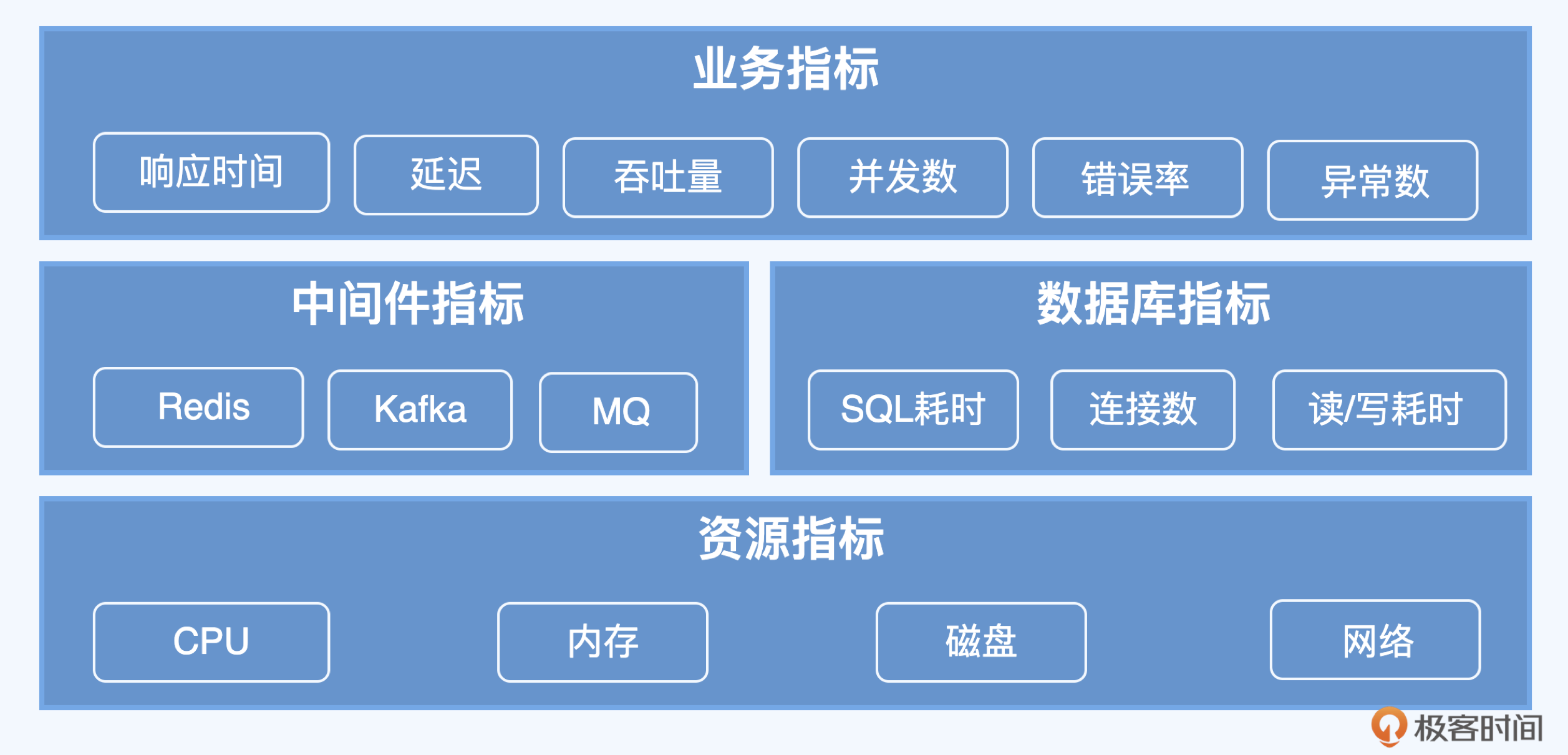 不过,在实践中我发现分析容量指标还真是一项极具挑战的任务,其中很大一部分原因在于,系统容量受制于多种因素,牵涉到多个指标,复杂程度远远超过想象。下图是我分类整理过的指标集合,你可以看到,分析容量指标需要对服务架构、中间件、服务链路等环节都有深入理解,这就导致很多人一上来就撞了南墙,颇有“从入门到放弃”的感觉,坚持下来的人也往往会遇到各种误区,艰难前行。