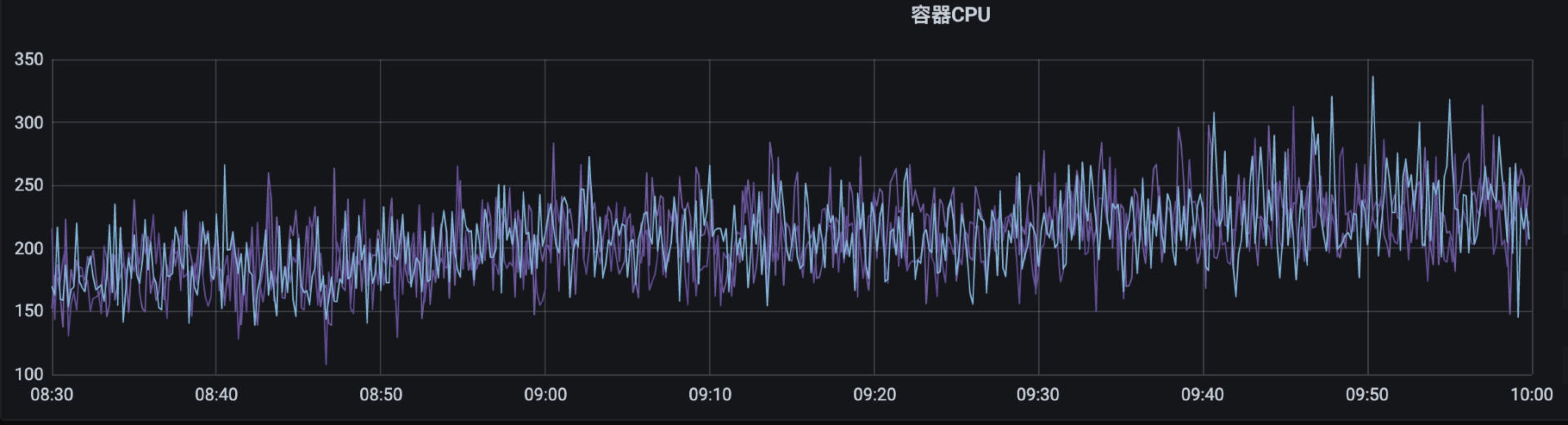 下面有两张监控指标图,展示了某服务在相同时间段的响应时间和CPU利用率情况。可以看到,在09:00 - 09:35这个时间段服务的响应时间暴增,已经严重影响了线上功能,但CPU利用率始终维持在一个较低的水位(图中纵轴为所有CPU核心的总利用率,该服务CPU共有8核,总计上限为800),光看CPU利用率似乎没有观察到任何问题。