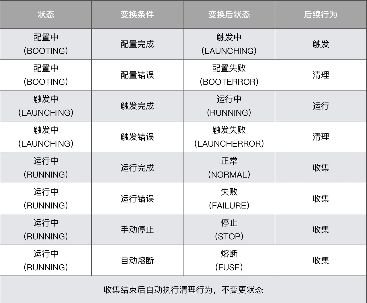 其中,我将配置、触发、运行、收集、清理定义为五大内部行为(平台内部逻辑管控),这五大内部行为都会改变测试的状态;同时,我们还会允许一些外部行为去干预测试工作,比如在运行过程中需要人为停止测试,外挂的监控组件判断异常后主动熔断测试等,这些外部行为也会改变测试的状态。你可以通过下面的表格,理解各个行为对测试状态的影响,以及对应的后续行为是什么。