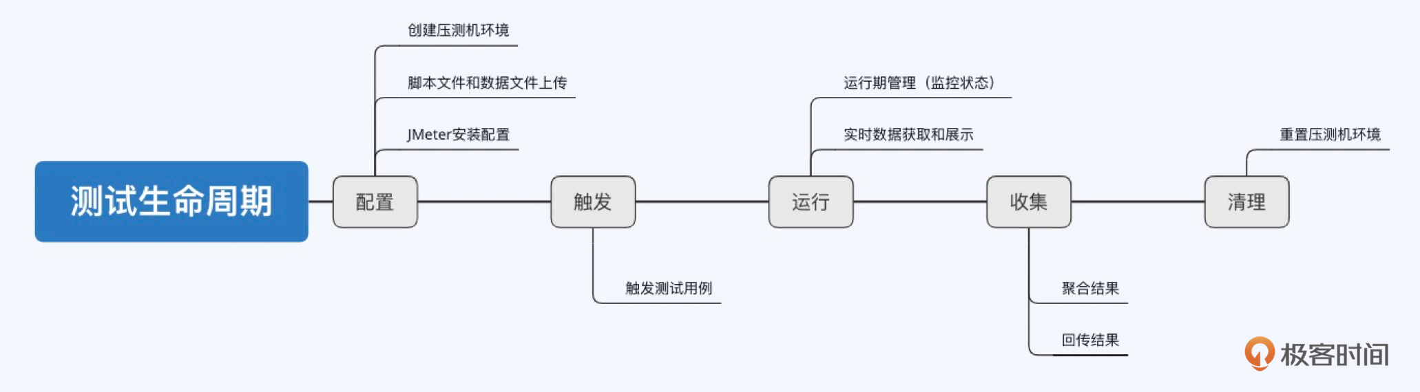 测试状态流转是压测平台管理测试工作的核心,所以我放在第一个讲。和人类的生老病死一样,每一轮成功的测试工作会经历一个完整的生命周期,可以描绘成下面这条主线。