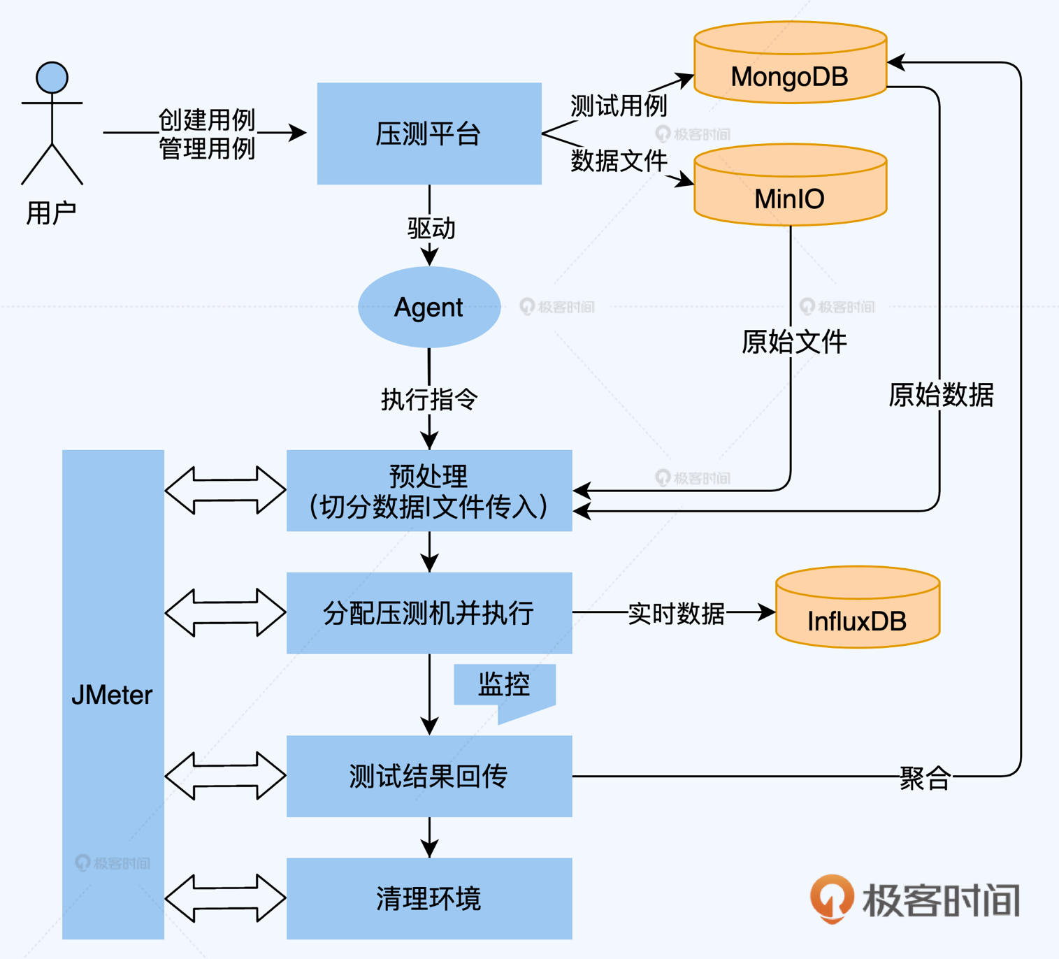 下图是分布式压测平台的顶层设计图,它是典型的Java Web项目,平台本身不执行测试只做调度,避免成为施压的瓶颈,后台均使用JMeter执行测试。平台会对挂载的压测机进行心跳检测,确保压测机是可用的。用例和数据文件可以存储在服务器本地,或者采用MinIO进行高可用的文件对象存储。压测期间产生的冷数据持久化至数据库,热数据持久化至时序数据库(InfluxDB)并定期清理。平台允许挂载外部监控模块,对压测过程进行干预。