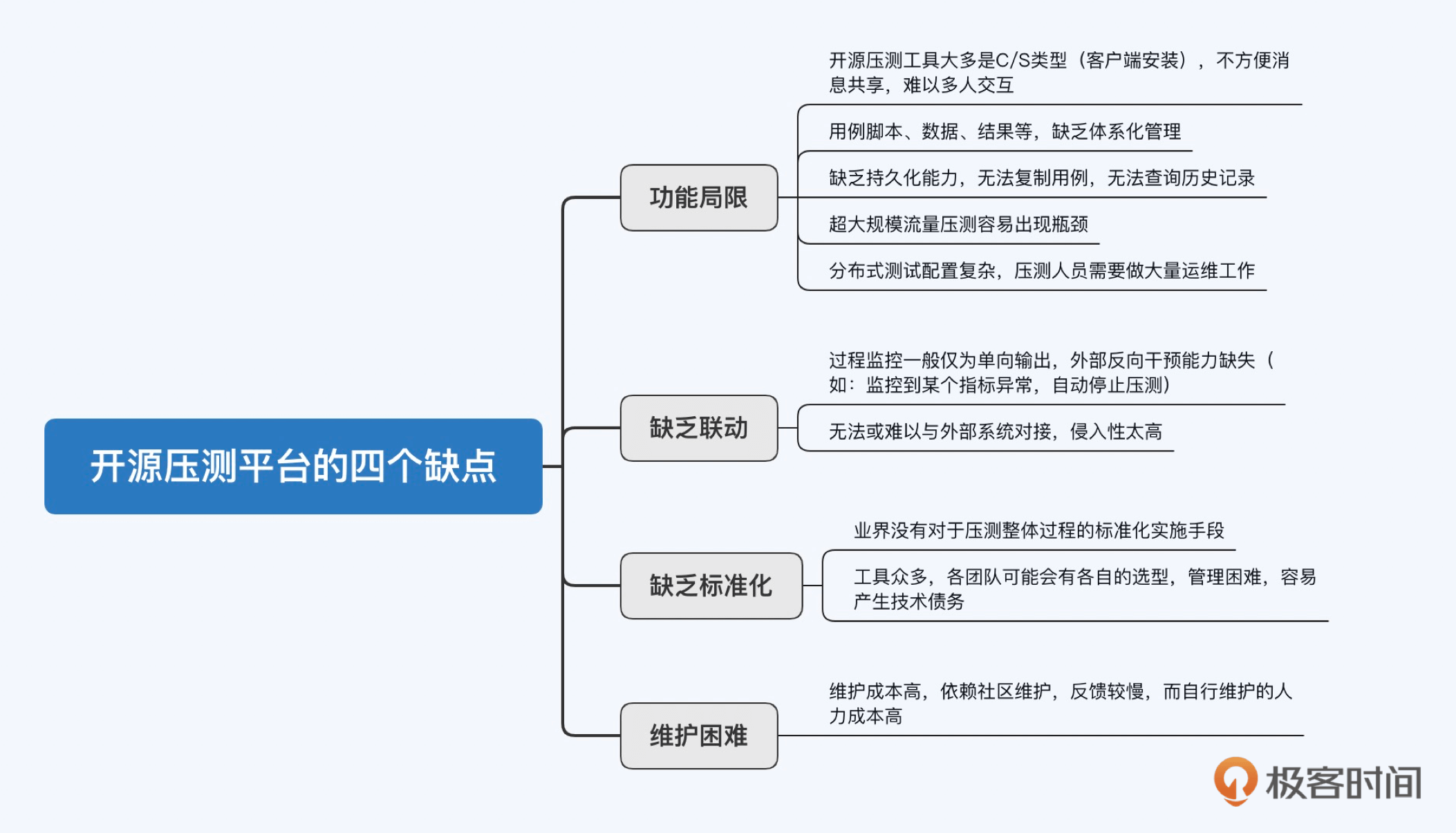 现在只要是规模大一些的互联网公司,都在不遗余力地开发自己的压测平台,比如京东、美团、阿里、360。可能你会问,市面上已经有无数的开源压测工具和平台,比如JMeter、Locust、nGrinder、Gatling等,为什么要自己做呢?我在和一些大厂的同行交流经验时,发现对于常见开源压测工具的诟病不外乎有以下几点。