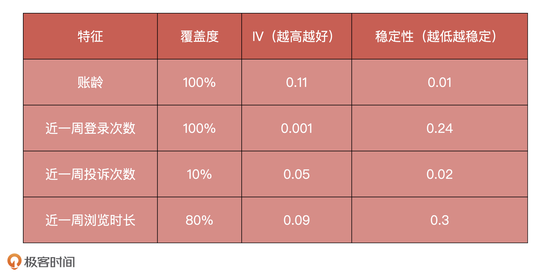 比如说,我们在预测流失用户项目中,筛选出了账龄、最近一周登录次数、投诉次数和浏览时长这几个特征,我把它们对应的覆盖度、IV值、稳定性都统计在了下面的表格中。