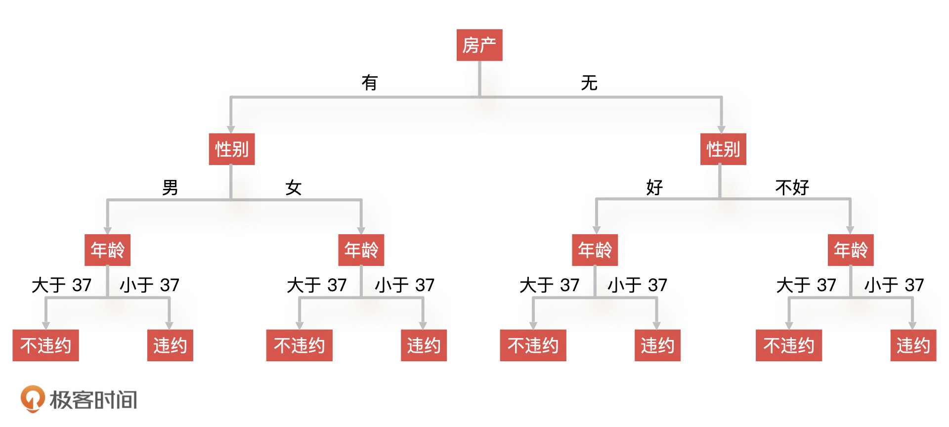 这节课,我就通过决策树预测用户会不会违约的例子,来给你讲讲决策树和随机森林的原理和应用。