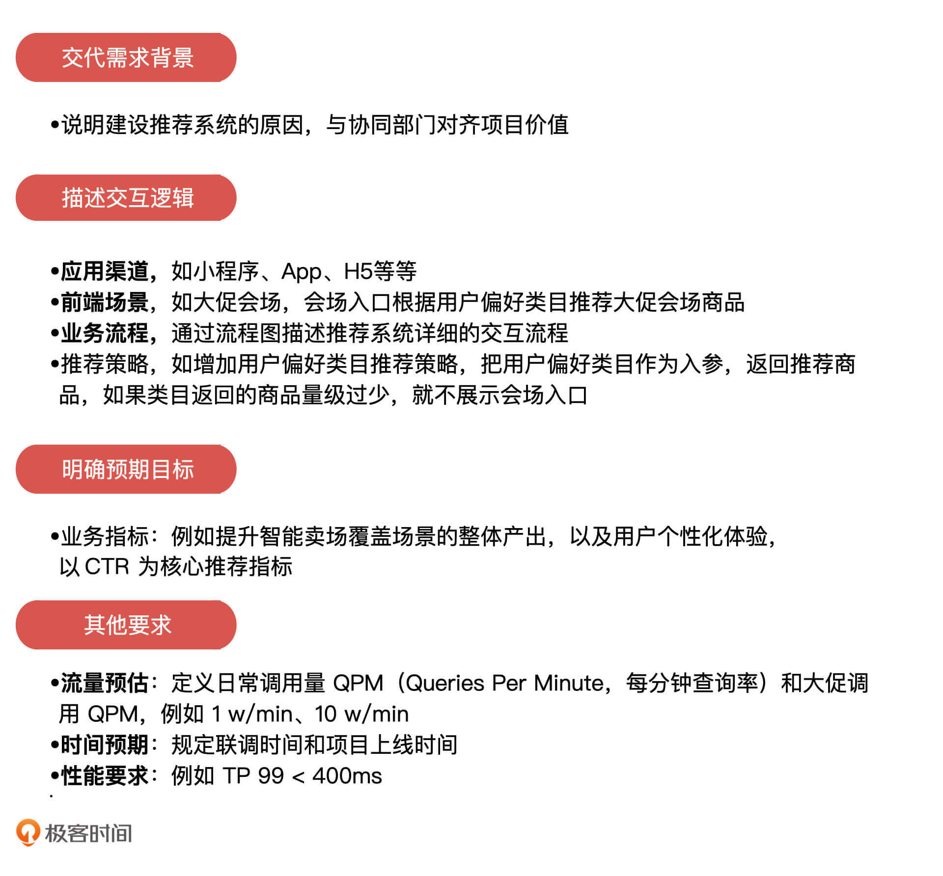 第一,我们要能够清晰地设计需求:需求定义要明确需求背景、功能描述,以及预期的收益。- 第二,我们要能够理解数据:在推荐系统的数据准备阶段,产品经理要关注用户前端的埋点日志,提前设计埋点,以及给研发工程师提需求收集行为日志。- 第三,我们要能够对通过 AB 测试来评估推荐系统的效果,然后做出分析再给予持续的迭代计划。
