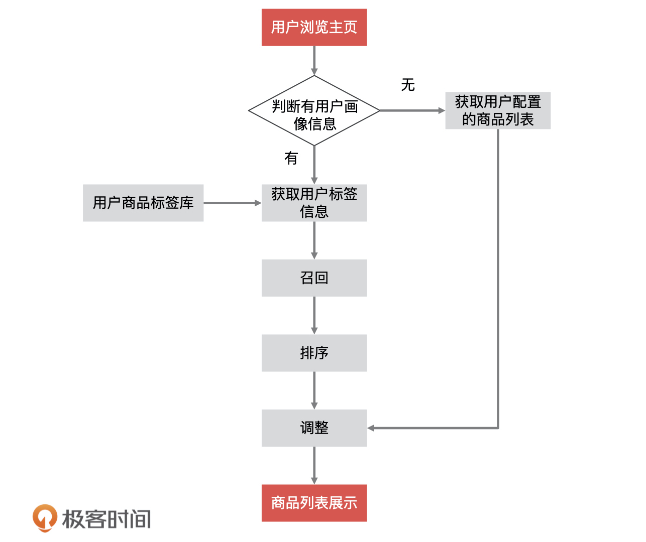 首先,当用户进入商品主页的时候,推荐系统会检查是否已存在当前用户的画像信息。如果存在就获取用户的商品偏好标签,执行商品召回的算法逻辑,如果不存在就把运营系统配置的商品数据展示给用户。
