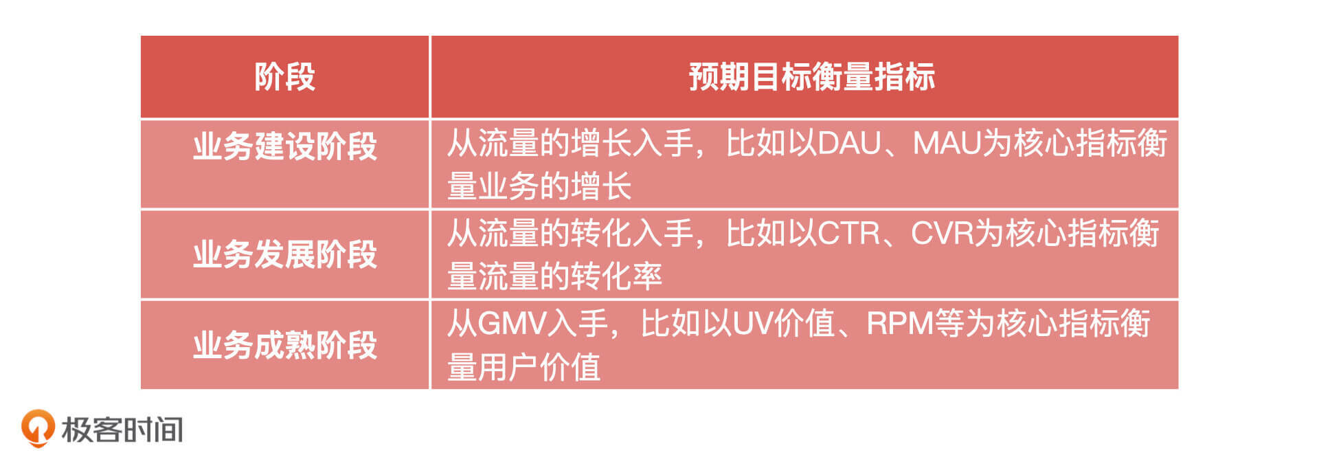 最后就是制定电商推荐系统的预期目标了,这个目标是根据业务的实际情况而设定的。有了目标就要有衡量目标的指标, 虽然大多数推荐系统的衡量指标都是 CTR,但我建议你从业务的建设阶段来设定衡量指标,就像我上节课讲的那样。这里,因为我们的业务发展属于成熟阶段,所以设定的衡量指标为 CVR。