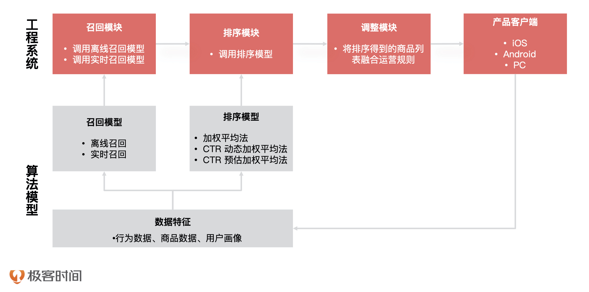 具体来说,对于系统工程的整体设计,产品经理要关注推荐系统进行一次完整推荐会涉及哪些系统模块,它们和算法模型是怎么交互的,数据流向什么样,产品的关键逻辑是在哪个模块中实现的。