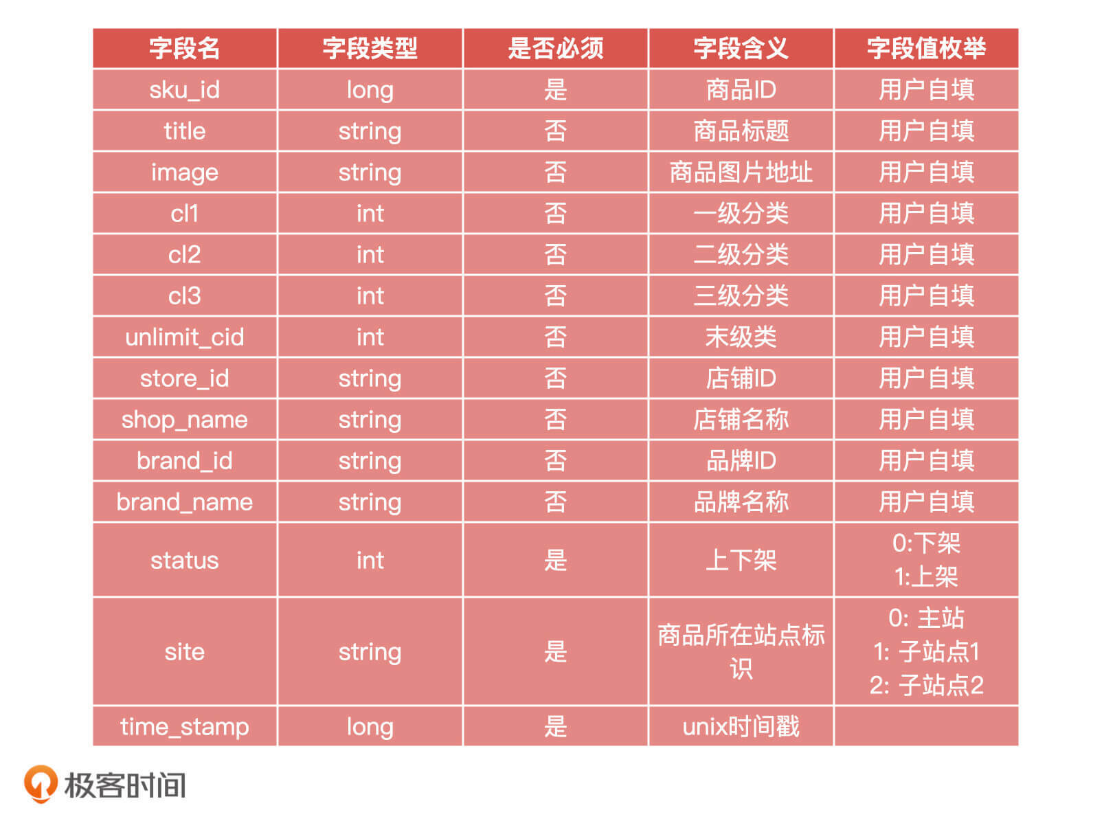 然后是商品信息数据埋点字段: