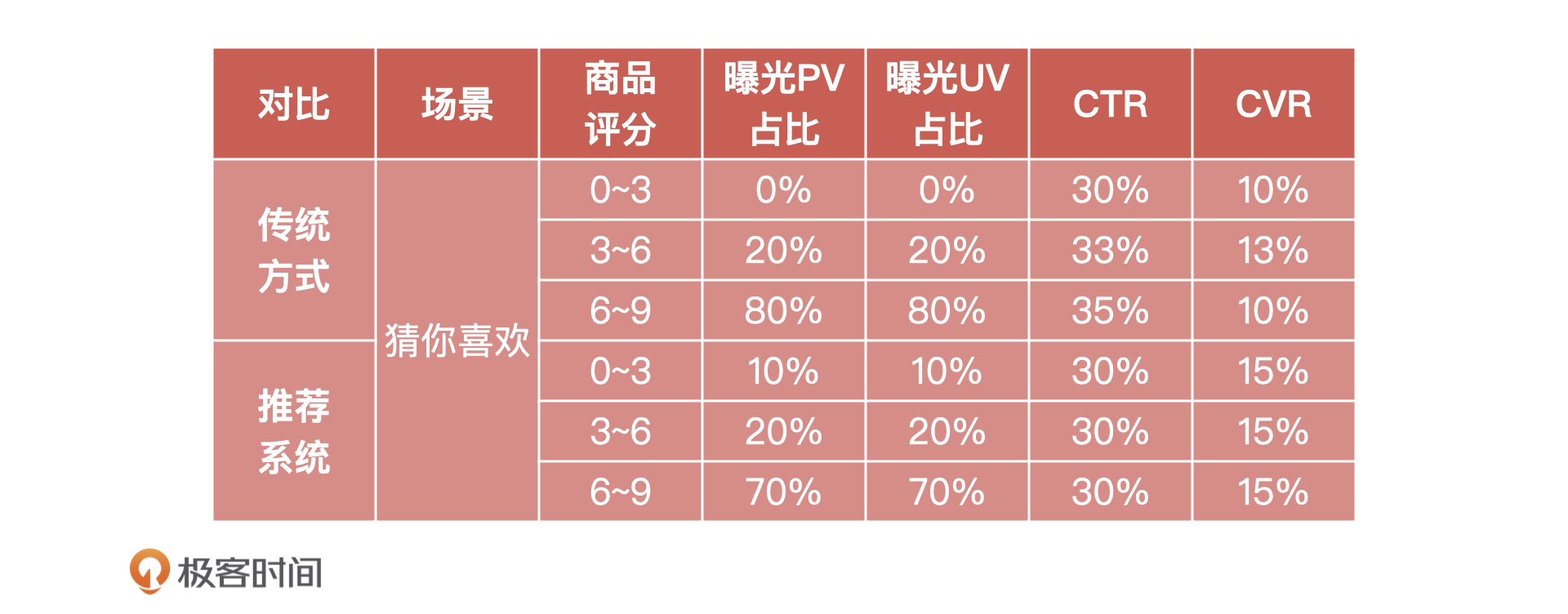 对比之下,我们可以看到,“传统方式”的 0~3 分的长尾商品没有曝光,这是因为我们之前一味地追求 GMV,所以运营同学对于低评分的长尾商品不做展示,把所有资源都倾向于头部品牌商的商品,让中小商家在平台上无法生存。因此,从长远的角度来看,一味的追求GMV并不健康。