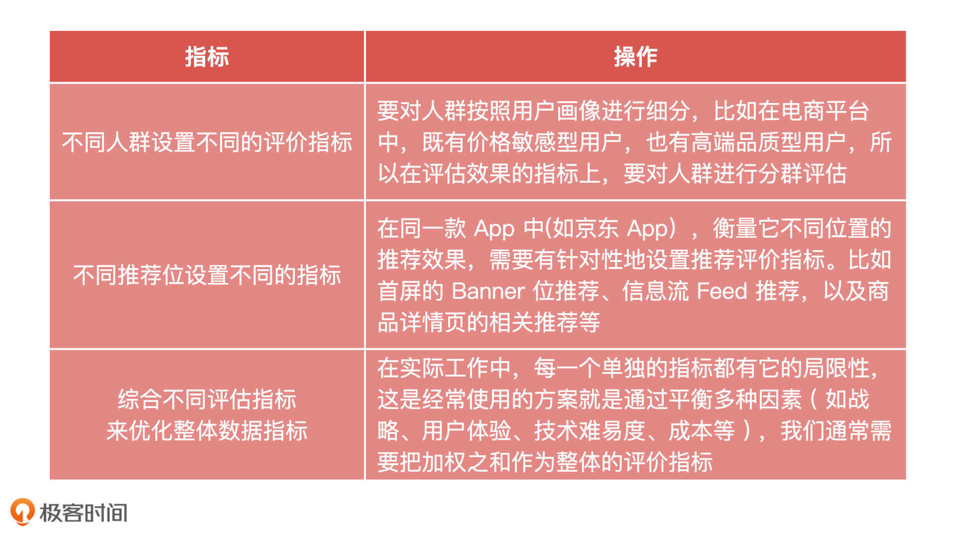 除此之外,在对于推荐系统的迭代计划中,产品经理至少还要对不同人群、不同位置设置不同的评价指标,最后再综合所有的评估指标来优化整体数据指标。具体操作时的注意事项,我都总结在了下面的表格中,你可以看看。