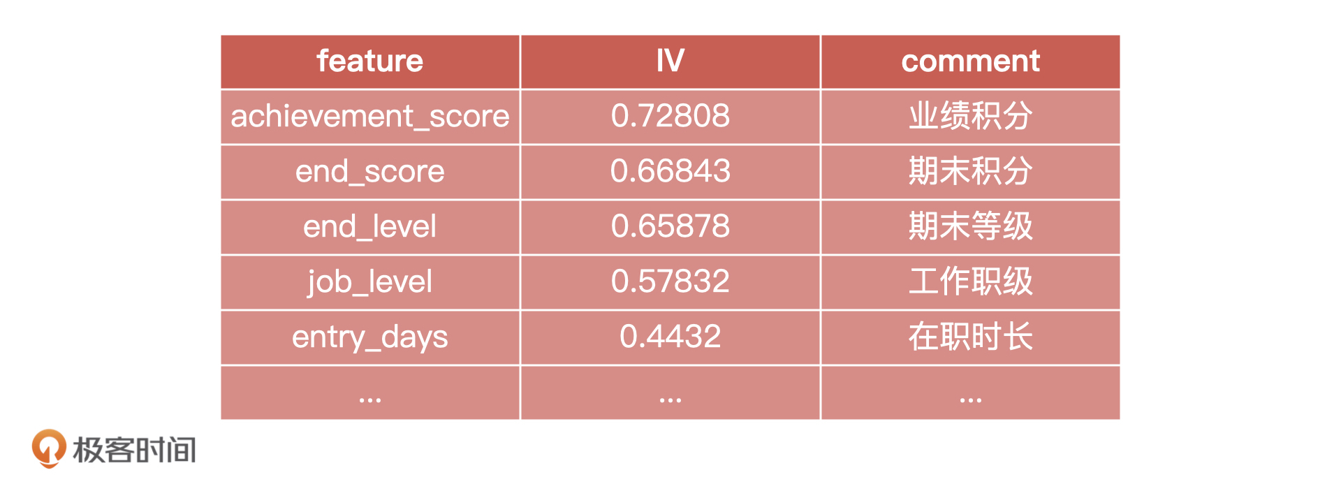 需要注意的是,IV 值并不是越大越好。根据不同场景 IV 值的取值有所不同,实际的场景中,我们可以选择 IV 值大于 0.1 的指标。