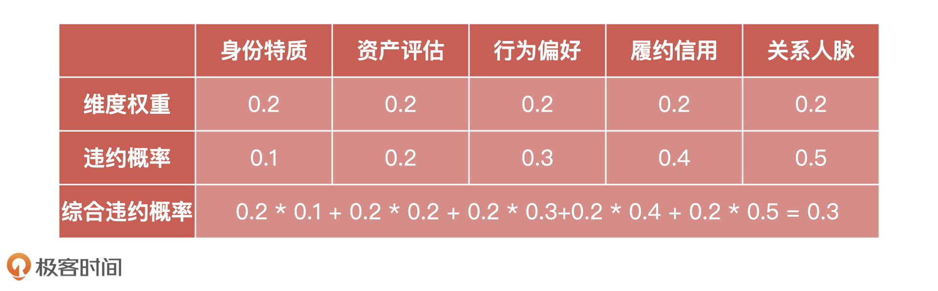 通过这个方法,我们依次计算出 5 个维度(身份特质、资产评估、行为偏好、履约信用、关系人脉)的概率,分别为 0.1、0.2、0.3、0.4、0.5。然后,我们再假设每个维度的权重都为 0.2,具体如下表所示: