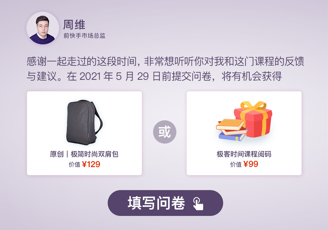 另外,这里我还给你准备了一份毕业问卷,希望你能花两三分钟填写一下,非常期待能听到你对这门课的反馈。