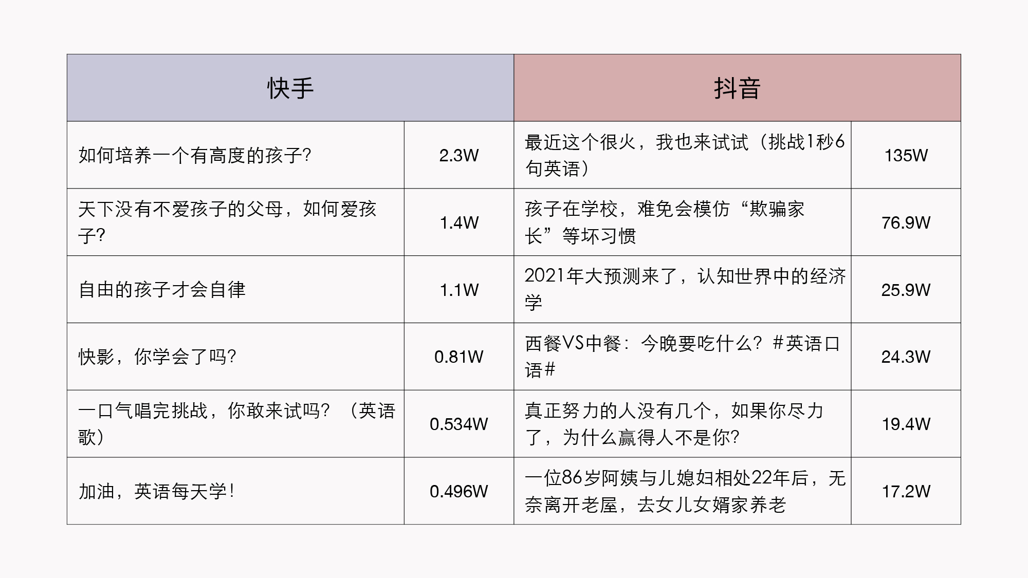 • 差别用户:抖音的职场一族多一些,偏爱财经类知识;快手上妈妈用户居多,喜爱关注孩子的成长。抖音的下沉与中老年用户不少,喜爱情感教育;快手上的用户多是忠诚粉丝,更加关注平台剪辑工具的学习。