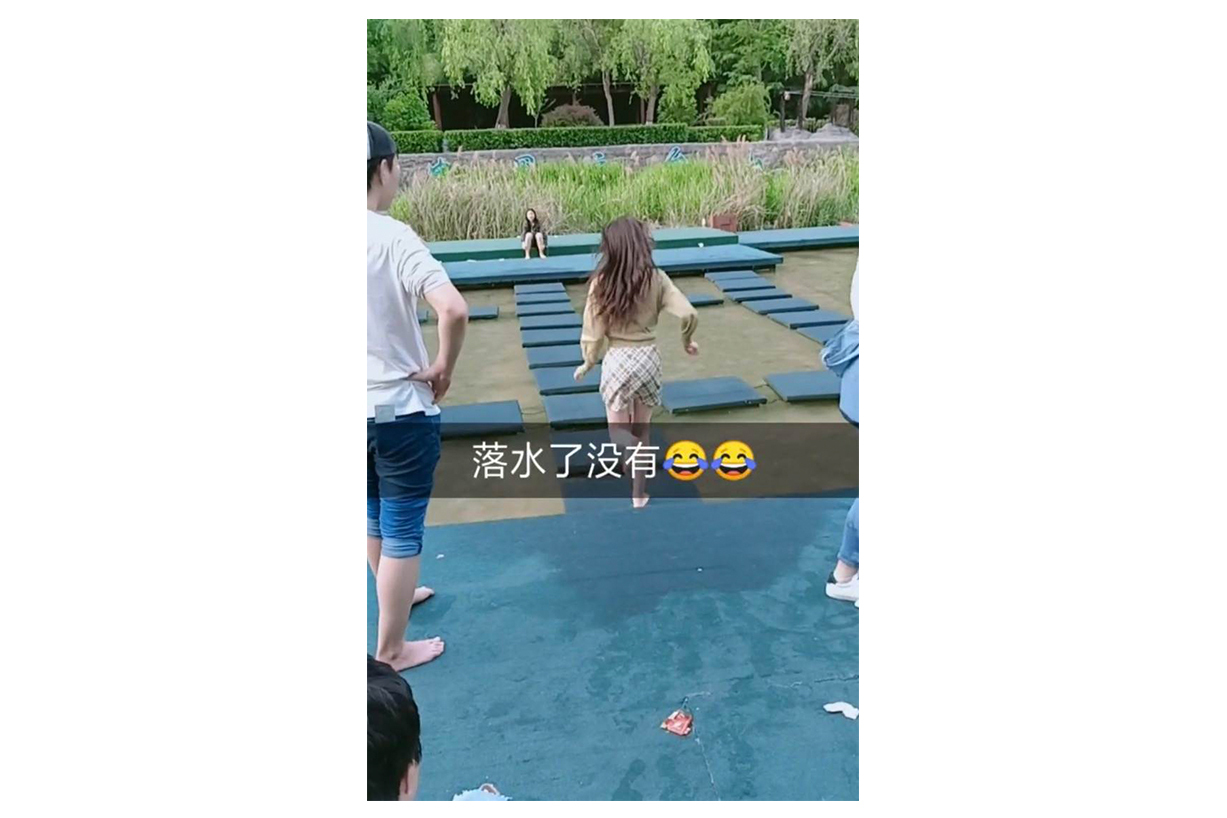 我举个例子,有一位Vlog博主用短视频记录了和朋友在公园玩浮垫的游戏过程,游戏规则是这样的:如果可以快速通过摇晃不定的浮垫到达对岸就是胜利,反之失败。