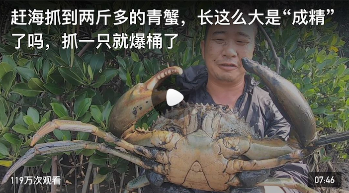 一般来说,在短视频领域,猎奇封面多出现在旅行、三农类等创作内容中,封面上是以具有视觉冲击力的当地特色元素为主。比如,一个生活类内容创作者,有一次在海边赶海看见了巨大的一只青蟹,于是视频封面就用了他表情夸张怀抱大虾的画面,起到了猎奇与吸引注意力的作用。