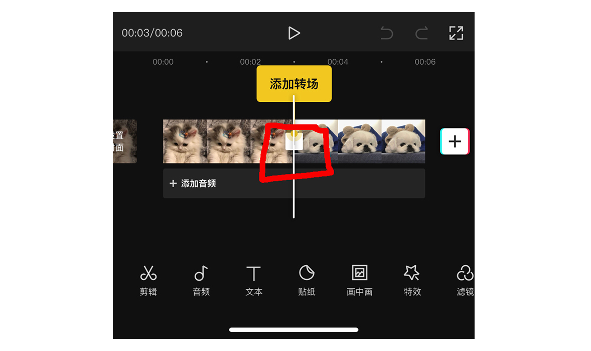 我还是拿剪映中的转场效果来给你介绍一下。当你上传了两段及以上的视频素材时,在两个素材的中间会出现一个白色的方块,点击一下,就会进入到转场效果的设置中。