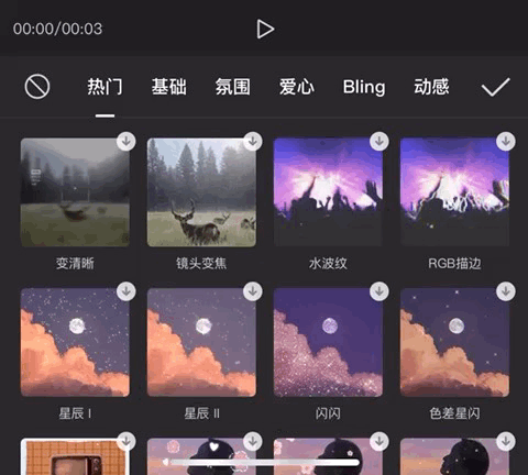 1. 在剪辑水平不是很熟练的情况下,我建议你可以多采用“热门”中的特效。这里的特效往往是受用户欢迎或者是一段时间内平台重推的特效功能,使用这些特效也完全可以满足作品剪辑的需求。