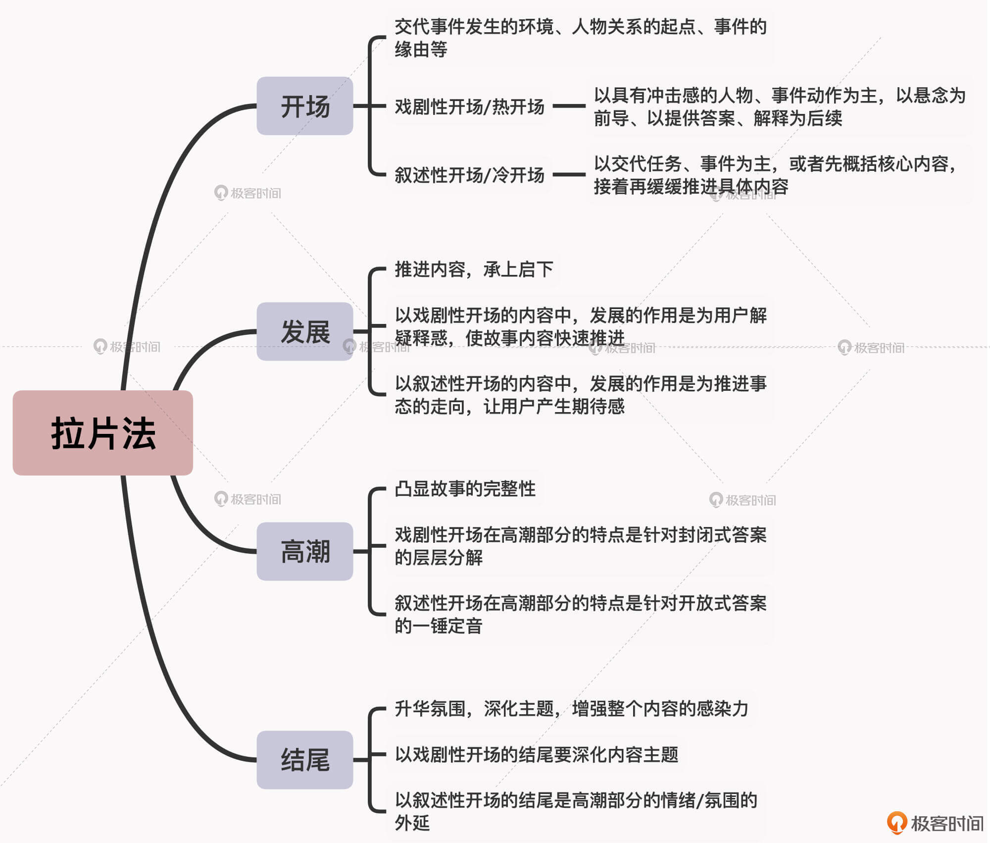 好了,以上的内容就是按照开场、发展、高潮、结尾四大部分进行的拉片子的过程。另外我这里要提醒你一下,当你选中了一款爆款短视频进行拉片子时,可以分三次进行梳理。第一次,边看边感受内容的叙事节奏和风格等;第二次,要进行结构拆分,整理笔记;第三次,选取内容中的重点场面进行细致的分析,记录下这些优质内容在运营上的方法与技巧,之后结合自己创作的内容进行实践。