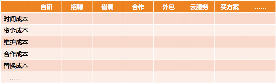 以上的说法和判断,是我基于我之前的团队情况给出的。那么对于你来说,不同的方案意味着着多大程度的成本呢,你可以尝试把你认为的“大”“中”“小”填入下表中。这个表格最大的意义不在于让你去评估每一种方案的成本大小,而在于扩展你的管理思路,看到解决问题手段的多样性,避免思路过于单一,就达到目的了。