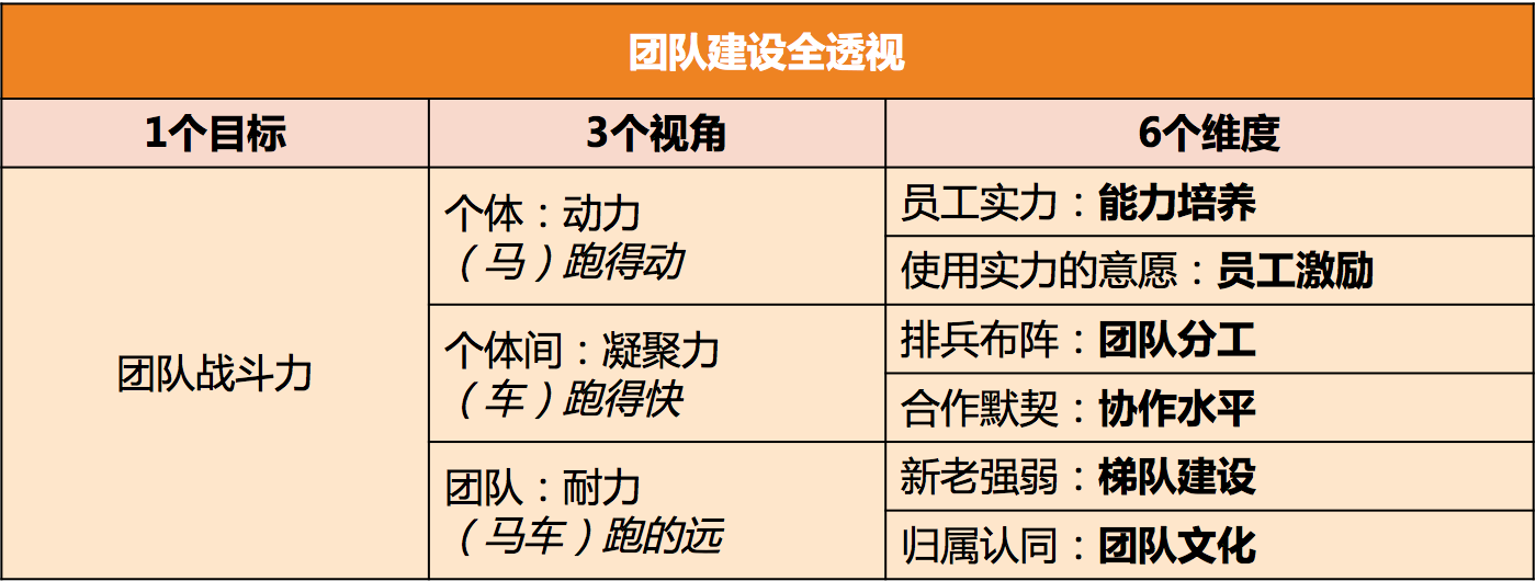 综合上面我们对“马队”3 个层次的解析,就得到了团队建设时 6 个维度的工作要素: