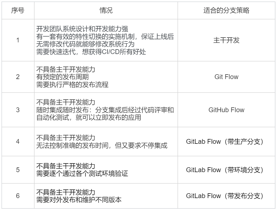 接下来,我就总体归纳一下什么情况下应该选择什么样的分支策略。如表4所示。-