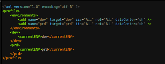 ConfigGen 的使用也很简单,只要一个 ConfigProfile.xml 文件即可,dev和prd指两个入参,根据这两个入参分别定义了currentENV的具体值,如下图所示。