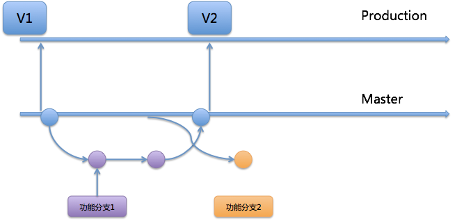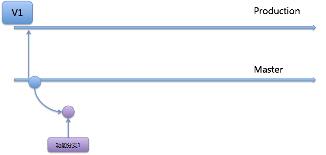 首先,项目仓库的初始状态如图2所示。这里有一个版本V1,代码仓库中有2个分支:Master,是集成分支;Production,是发布分支。