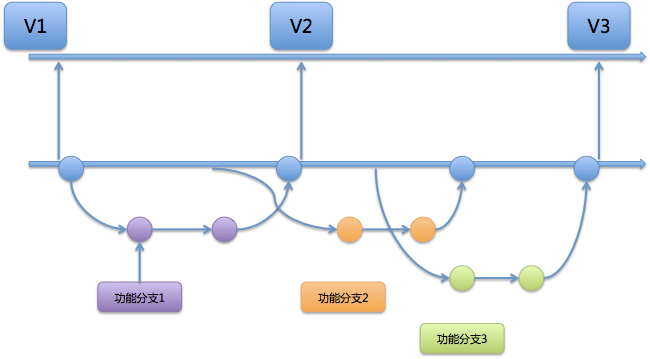 从图5中,我们可以看到,V2版本后,又出现了一个新的功能分支3,它与功能分支2并行开发。这两个功能分支合并入Master之后,被同时附加到版本V3中。