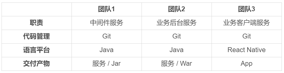 要模拟的团队有3个,分别为中间件团队、后端业务团队和移动App团队,3个团队最终产出一个可工作的移动App。