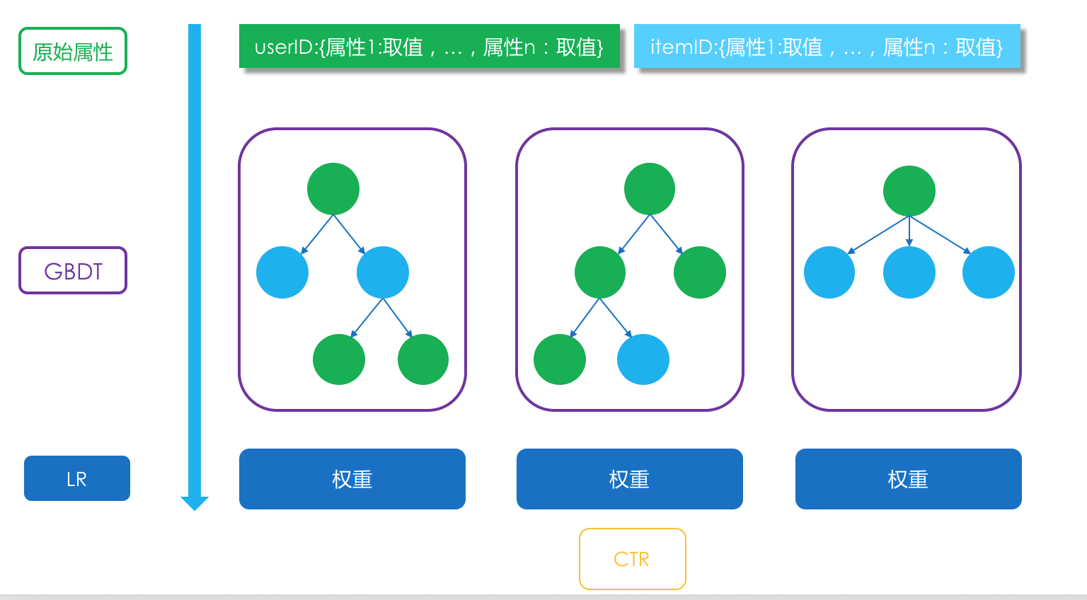 每一条样本,样本内容一般是把用户、物品、场景三类特征拼接在一起,先经过N棵GBDT树各自预测一下,给出自己的0或者1的预测结果,接着,这个N个预测结果再作为N个one-hot编码特征拼接成一个向量送入逻辑回归中,产生最终的融合预估结果。