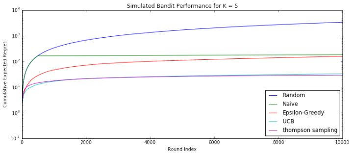 横坐标是模拟次数增加,可以看成随着时间推移,纵坐标就是累积遗憾,越高说明搞砸的次数越多。在模拟后期,基本上各种算法优劣一目了然。从上到下分别是下面几种。