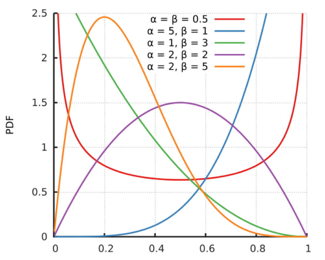 关键在于每个臂背后的概率分布,是一个贝塔分布,先看看贝塔分布的样子: