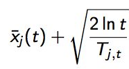 公式有两部分,加号前面是这个候选臂到目前的平均收益,反应了它的效果,后面的叫做Bonus,本质上是均值的标准差,反应了候选臂效果的不确定性,就是置信区间的上边界。t是目前的总选择次数,Tjt是每个臂被选择次数。