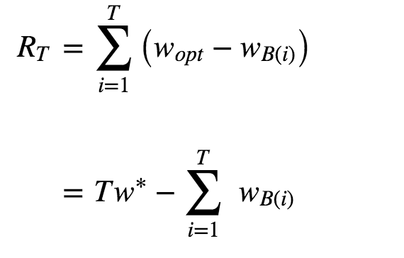 Wopt就表示,每次都运气好,选择了最好的选择,该得到多少收益,WBi就表示每一次实际选择得到的收益,两者之差就是“遗憾”的量化,在T次选择后,就有了累积遗憾。