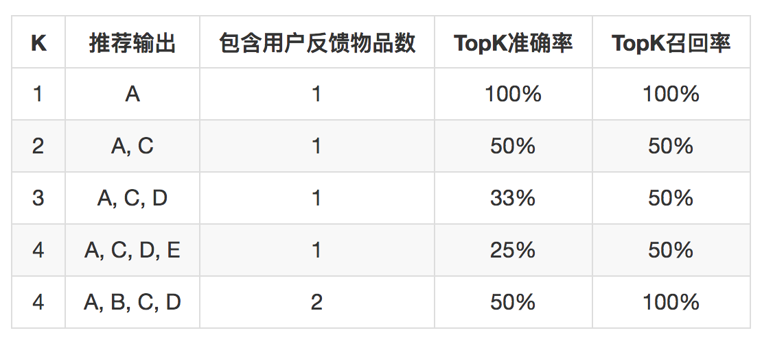 如果日志中用户有A、B两个物品有正反馈行为,推荐系统推出一个物品列表,长度为K,这个列表中就有可能包含A、B两个物品中的一个或多个,下面这个表格就说明了TopK准确率和TopK召回率的含义。