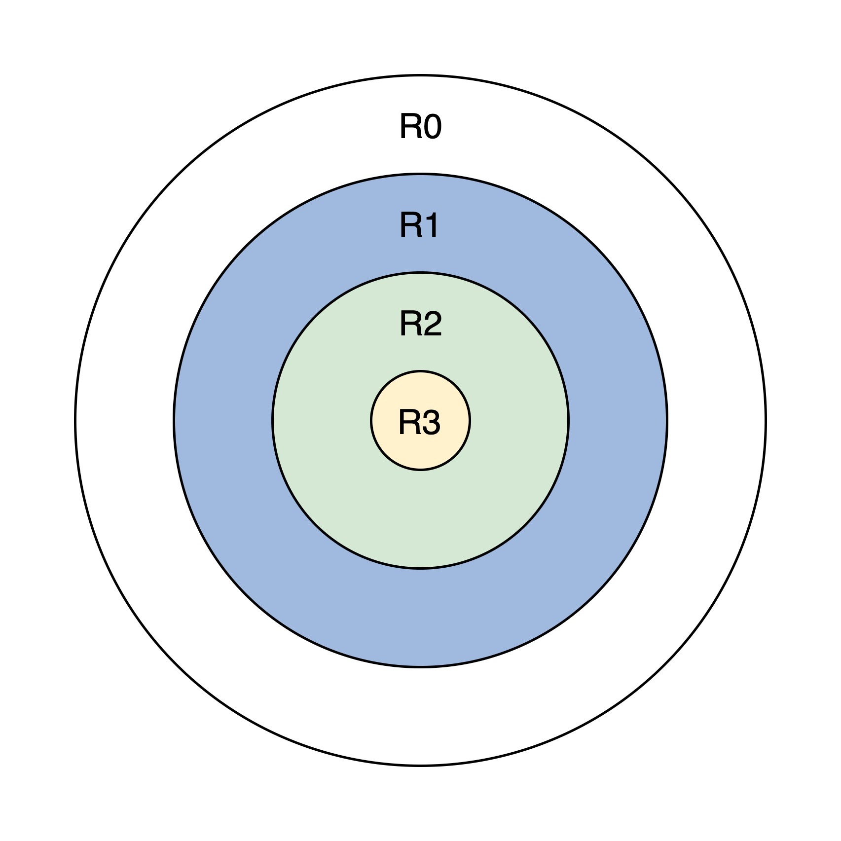 上面的圆环图,从外到内,既能体现权力的大小,又能体现各特权级对资源控制访问的多少,还能体现各特权级之间的包含关系。R0拥有最大权力,可以访问低特权级的资源,反之则不行。